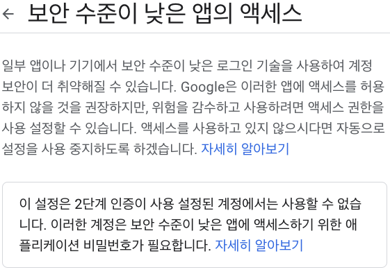 보안 수준이 낮은 앱의 액세스 <- 요것이~ 이제 안먹힙니다