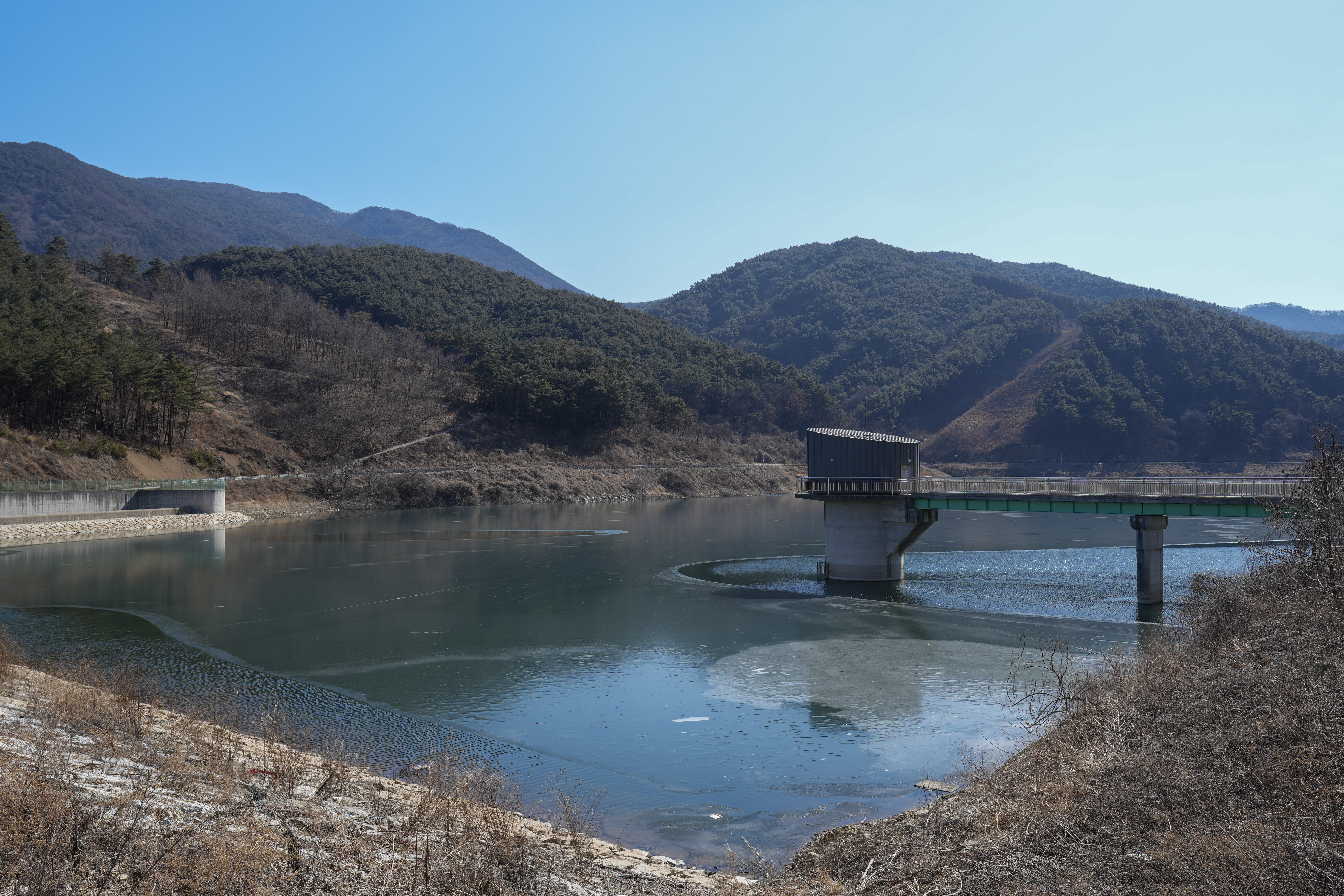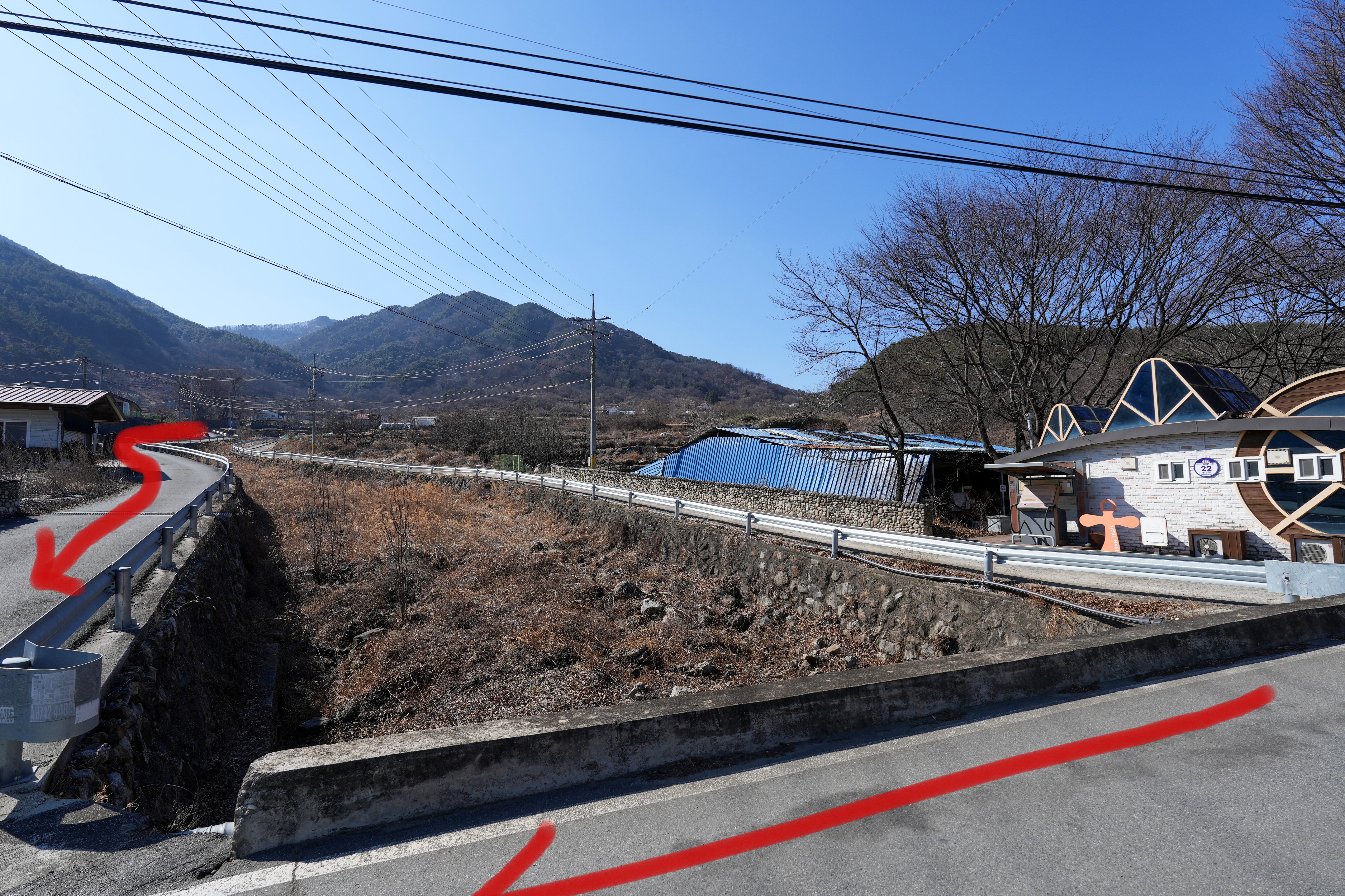 길 따라 쭉가면 왼쪽에는 강과 다리가 있고 여기서 오른쪽으로 쭉가면 저수지가 나옵니다